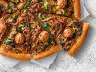 餡料 燻雞絲、洋菇、番茄丁、洋蔥、莫札瑞拉起司、洋香菜葉、日式照燒醬、美奶滋